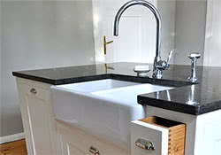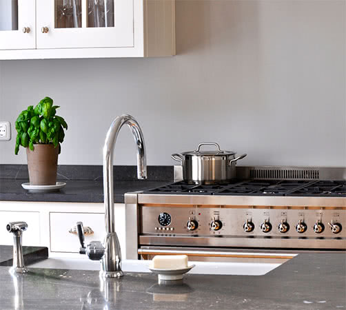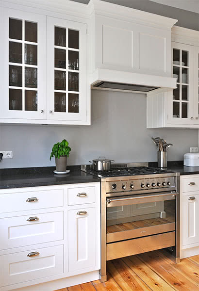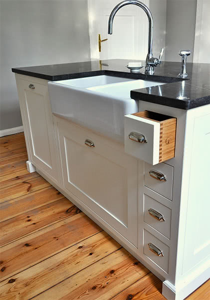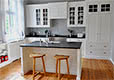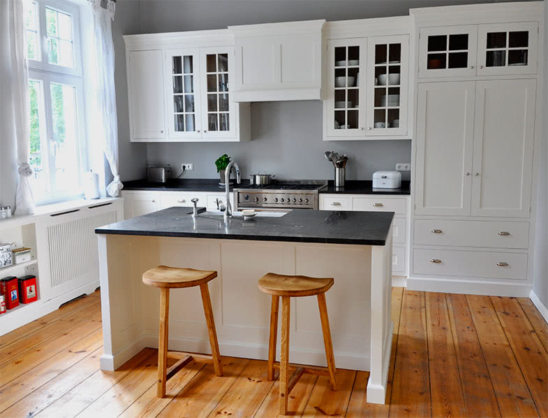 Helle und einladende Landhausküche in „Whimborne White®“ mit belgischer Blausteinarbeitsplatte.