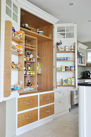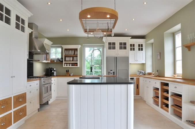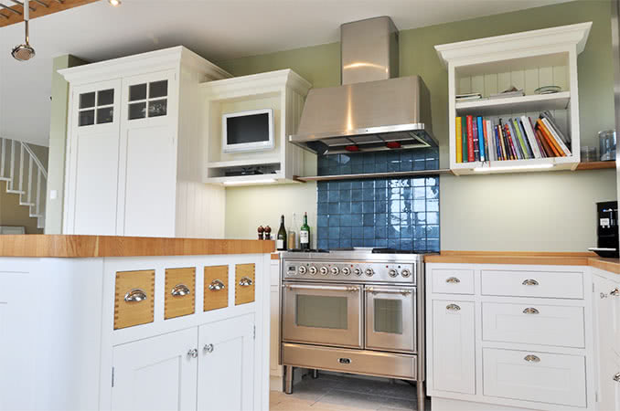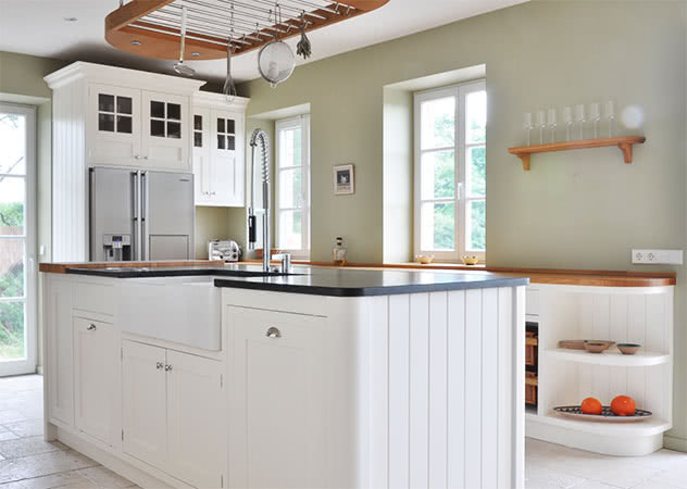 Klassicher Shaker-Stil in „Wimborne White®“ und Eiche-Arbeitsplatte.