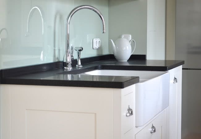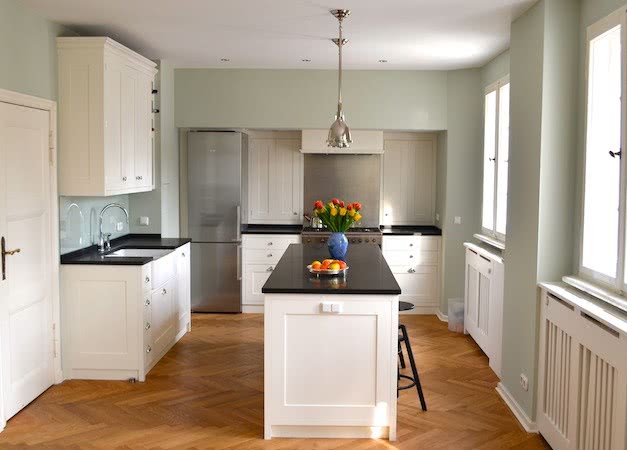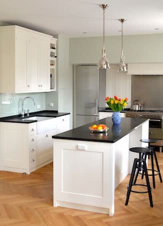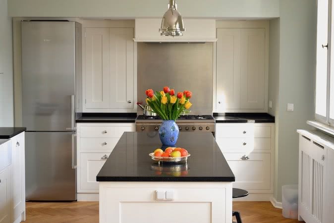 Moderner, geradliniger Landhausstil in „Wimborne®“ und einer Arbeitsplatte aus Nero Assoluto.