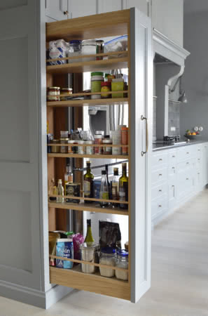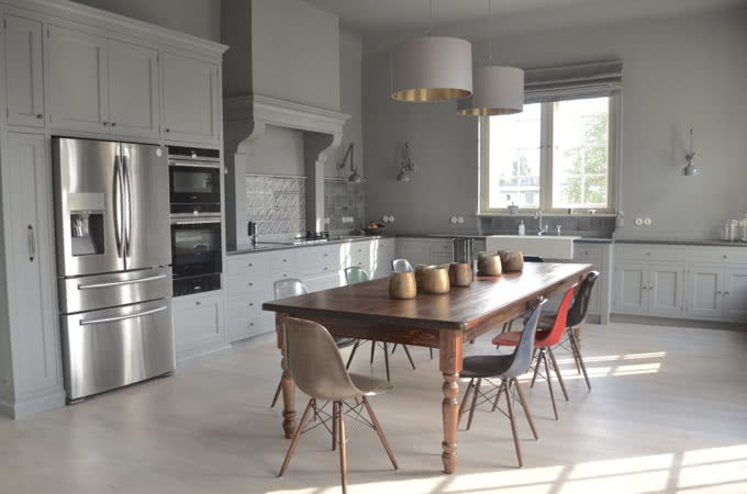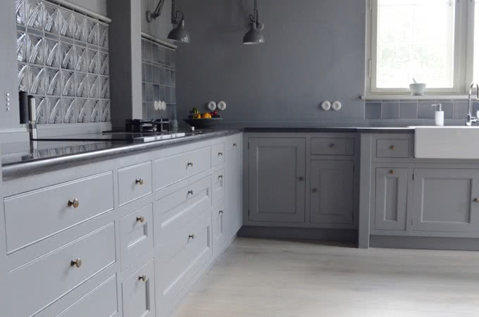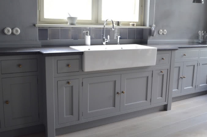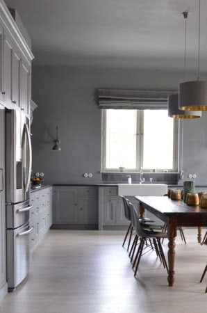 Verspielter Shakerstil in „Plummett®“ und Blaustein Arbeitsplatte, Fußboden aus Eiche-Schlossdielen, weiß gekalkt.